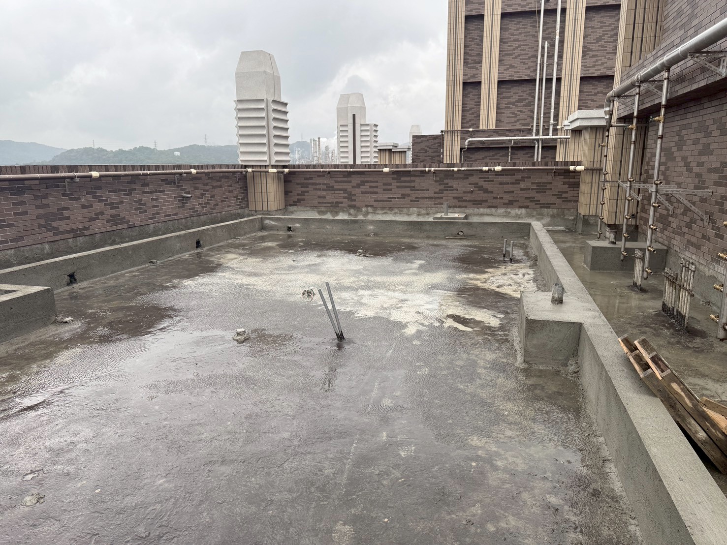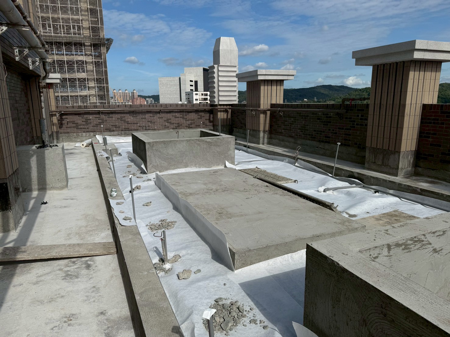 10 2025 基地空拍圖 2025.10.05 10F地磚施作 2025.10.05 大廳石材施作 2025.10.05 15F電梯框壁磚施作 2025.10.05 屋頂防水施作 2025.10.05 健身房鏡面安裝 2025.10.05